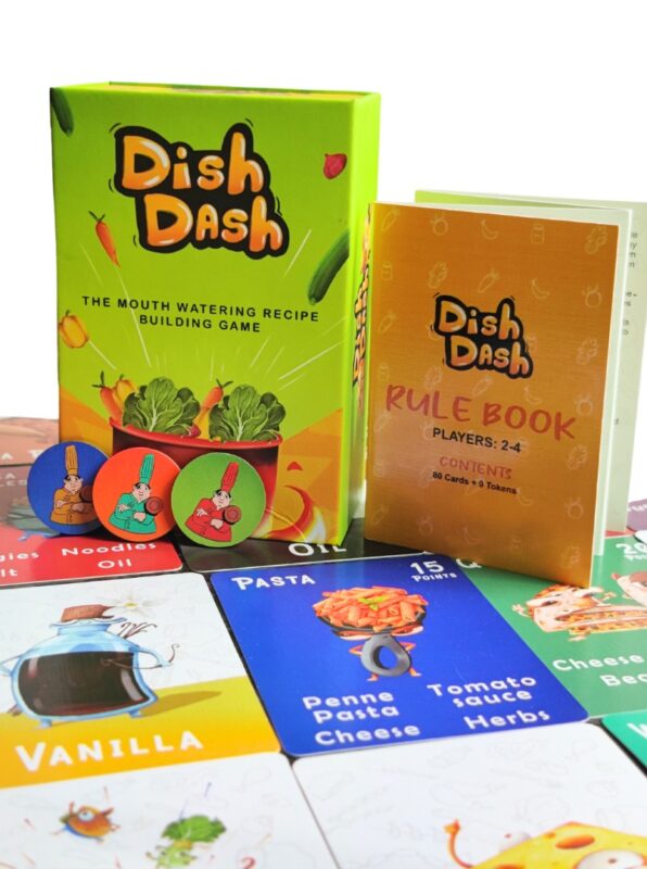Dish Dash is a set collection game by Blue Flamingo Games. The players aim to be the first to collect 50 points by completing recipes to win the game.